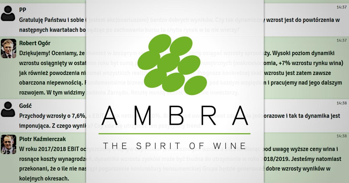 W czwartek, 13 września 2018 r. zorganizowaliśmy czat inwestorski z prezesem zarządu Grupy AMBRA, Robertem Ogórem oraz wiceprezesem, Piotrem Kaźmierczakiem. W czasie dyskusji przedstawiciele spółki odpowiadali na pytania dotyczące wyników finansowych spółki, polityki dywidendowej, sytuacji na rynku alkoholi, rozwoju linii FRESCO Frizzante i marki EL SOL oraz dalszej strategii działania Grupy. W spotkaniu wzięło udział ponad 700 inwestorów. Przedstawiciele spółki odpowiedzieli na 70 pytań. Zapraszamy do lektury całego zapisu czatu.