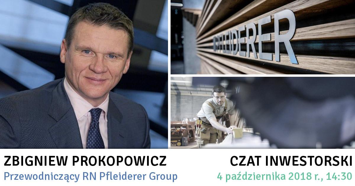 Grupa Pfleiderer to czołowy europejski producent wyrobów drewnopochodnych dla przemysłu meblarskiego, wnętrzarskiego oraz budownictwa. Grupa produkuje m.in. standardowe płyty wiórowe, blaty kuchenne, laminaty HPL, sztuczne okleiny oraz panele na bazie drewna. Spółka opublikowała właśnie wyniki finansowe za I półrocze 2018 r. Zapraszamy na czat inwestorski z przewodniczącym rady nadzorczej Pfleiderer Group, Zbigniewem Prokopowiczem, na którym rozmawiać będziemy o sytuacji finansowej spółki, zakończonym niedawno programie skupu akcji własnych i o planach dalszego rozwoju. Spotkanie odbędzie się w czwartek, 4 października 2018 r. o godz. 14:30. Zapraszamy do zadawania pytań już teraz.
