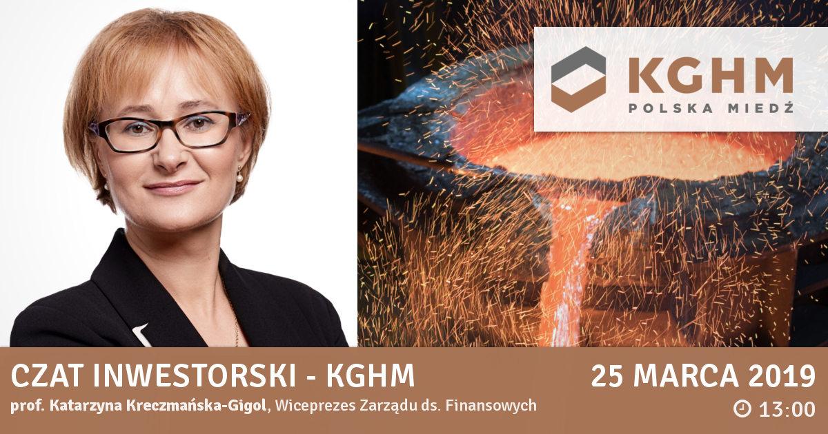 KGHM Polska Miedź S.A. to międzynarodowy producent miedzi i srebra, który realizuje projekty zasobowe w Polsce, Chile, Kanadzie i USA. 14 marca poznaliśmy wyniki finansowe spółki za IV kwartał 2018 oraz cały 2018 rok. O nich, o sytuacji finansowej spółki, realizacji strategii rozwoju oraz o perspektywach rynku miedzi i innych metali będzie można porozmawiać na czacie inwestorskim, który odbędzie się już 25 marca 2019 r. o godz. 13:00. W spotkaniu spółkę KGHM będzie reprezentować prof. Katarzyna Kreczmańska-Gigol, Wiceprezes Zarządu ds. Finansowych.