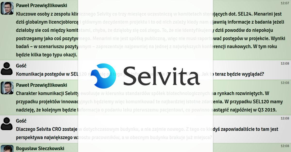 W środę, 3 kwietnia 2019 r. odbył się czat inwestorski Pawłem Przewięźlikowskim, Prezesem Zarządu oraz Bogusławem Sieczkowskim, Wiceprezesem Zarządu biotechnologicznej spółki Selvita. Podczas dyskusji rozmawialiśmy o podziale spółki na część innowacyjną i usługową. Inwestorzy zadawali również pytania o badania nad SEL24 oraz SEL120, przewidywaną sytuację finansową po spin-offie oraz dynamikę wzrostu Ardigen. Spotkanie cieszyło się dużym zainteresowaniem. W dyskusji wzięło udział ponad 420 inwestorów, a Zarząd spółki odpowiedział na blisko 80 pytań. Zapraszamy do lektury całej relacji z czatu.