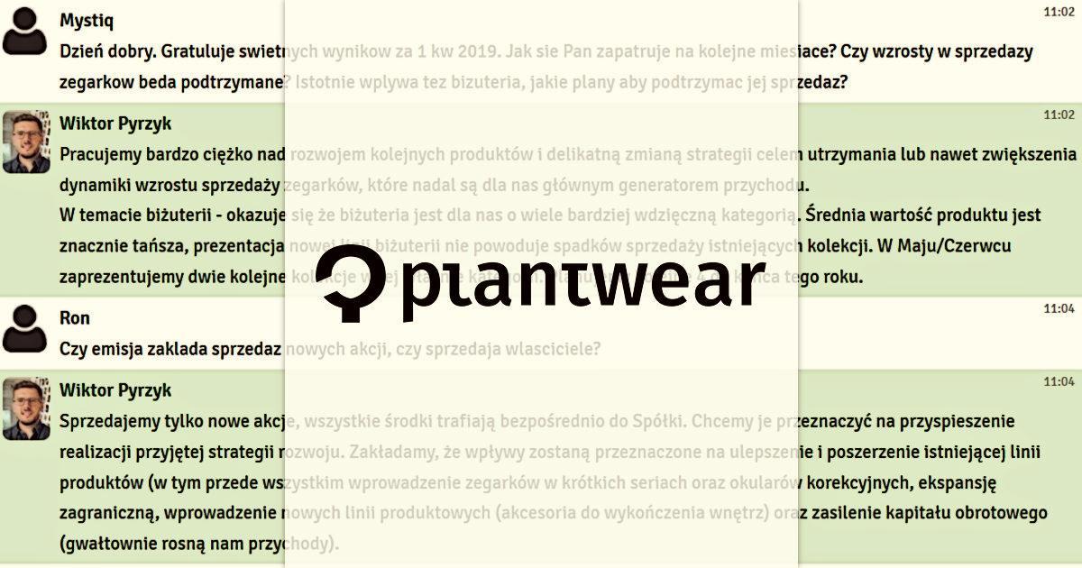 W poniedziałek, 6 maja 2019 r. odbył się czat inwestorski z założycielem i prezesem zarządu spółki Plantwear, Wiktorem Pyrzykiem. Rozmawialiśmy o wynikach finansowych za I kwartał 2019 roku, prezentowanej na platformie CrowdConnect.pl emisji akcji, czy planowanym debiucie na NewConnect. Inwestorzy zadawali również pytania o politykę dywidendową, ekspansję na rynki zagraniczne oraz działalność marketingową. W dyskusji wzięło udział blisko 500 inwestorów, a prezes spółki odpowiedział na prawie 40 pytań. Zapraszamy do lektury całej relacji z czatu.