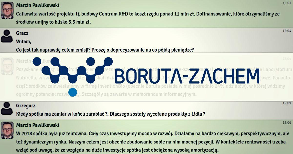 We wtorek, 6 sierpnia 2019 r. odbył się czat inwestorski z wiceprezesem zarządu Boruty Zachem, Marcinem Pawlikowskim. Podczas dyskusji rozmawialiśmy o trwającej emisji akcji. Inwestorzy zadawali również pytania o ekologiczne kosmetyki i środki czystości, realizację budowy Centrum Badawczo-Rozwojowego, ekspansję zagraniczną produktów oraz sytuację finansową spółki. W dyskusji wzięło udział niemal 300 inwestorów, a wiceprezes zarządu odpowiedział na blisko 40 pytań. Zapraszamy do lektury całej relacji.
