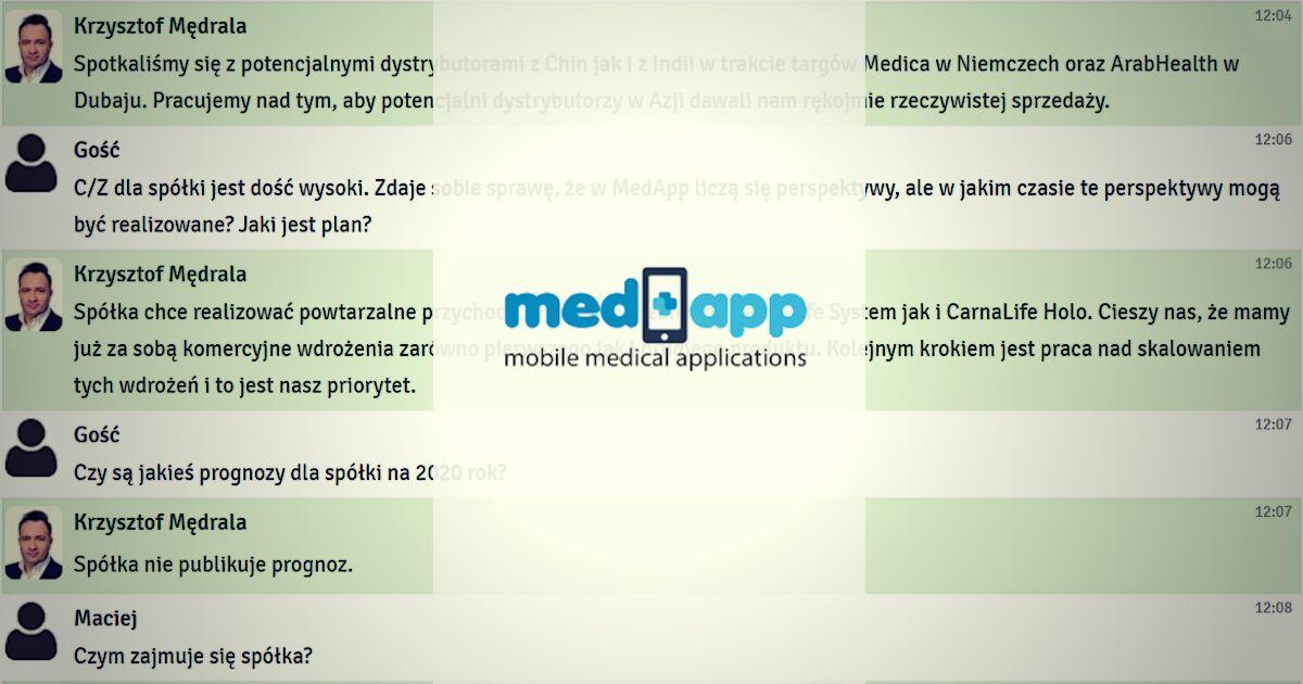 W czwartek, 20 lutego 2020 r. odbył się czat inwestorski z prezesem zarządu MedApp, Krzysztofem Mędralą. Podczas spotkania rozmawialiśmy o trwającej emisji akcji. Inwestorzy zadawali również pytania o sytuację finansową, komercjalizację produktów oraz perspektywy rozwoju na rynku MedTech. Spotkanie cieszyło się dużym zainteresowaniem - wzięło w nim udział 750 osób, a prezes zarządu odpowiedział na 30 pytań. Zapraszamy do lektury całej relacji z czatu.