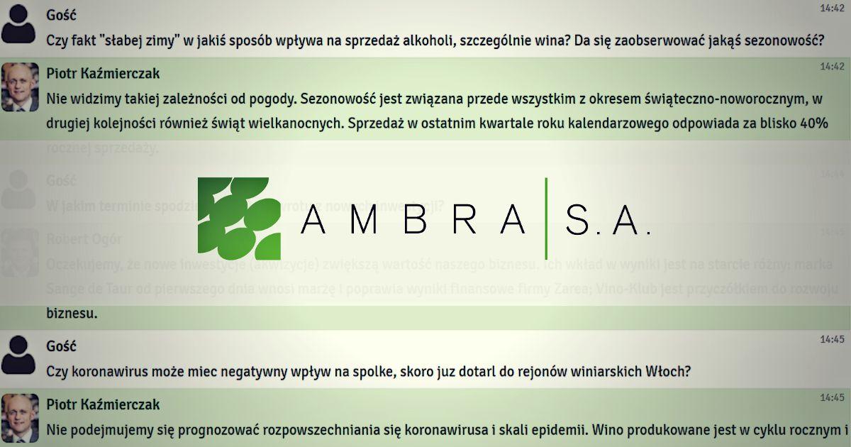 We wtorek, 25 lutego 2020 r. odbył się czat inwestorski z prezesem zarządu Grupy AMBRA, Robertem Ogórem oraz wiceprezesem, Piotrem Kaźmierczakiem. Podczas spotkania rozmawialiśmy o wynikach finansowych za I półrocze roku obrotowego 2019/2020. Inwestorzy zadawali również pytania o wypłatę dywidendy, międzynarodowy rynek win, rozwój sklepów Centrum Wina oraz planowane inwestycje. W spotkaniu wzięło udział ponad 500 osób, a zarząd odpowiedział na blisko 50 pytań. Zapraszamy do lektury całej relacji z czatu.