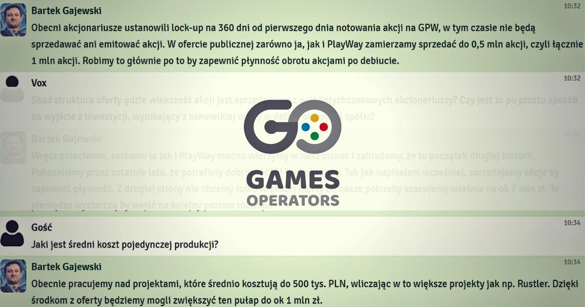 W piątek, 6 marca 2020 r. odbył się czat inwestorski z prezesem zarządu Games Operators, Bartkiem Gajewskim. Podczas spotkania rozmawialiśmy o publicznej ofercie akcji. Inwestorzy zadawali również pytania o debiut na GPW, sytuację finansową, plany wydawnicze oraz współpracę z PlayWayem. W spotkaniu wzięło udział ponad 500 osób, a prezes zarządu odpowiedział na blisko 40 pytań. Zapraszamy do lektury całej relacji z czatu.