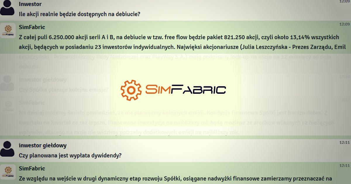 W poniedziałek, 6 kwietnia 2020 r. odbył się czat inwestorski z prezesem zarządu SimFabric, Julią Leszczyńską oraz przewodniczącym Rady Nadzorczej, Emilem Leszczyńskim. Podczas spotkania rozmawialiśmy o debiucie spółki na NewConnect. Inwestorzy zadawali również pytania o sytuację finansową, politykę dywidendową, planowane premiery gier oraz strategię spółki. W spotkaniu wzięło udział prawie 700 osób, a zarząd odpowiedział na blisko 50 pytań. Zapraszamy do lektury całej relacji z czatu.