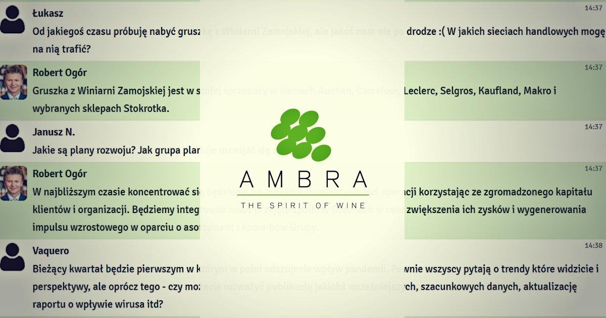 W środę, 13 maja 2020 r. odbył się czat inwestorski z prezesem zarządu Grupy AMBRA, Robertem Ogórem oraz wiceprezesem, Piotrem Kaźmierczakiem. Podczas spotkania rozmawialiśmy o wynikach finansowych za III kwartał 2019/2020 roku. Inwestorzy zadawali również pytania o wpływ pandemii COVID-19 na działalność spółki, plany rozwoju, politykę dywidendową oraz sprzedaż produktów. W spotkaniu wzięło udział blisko 550 osób, a zarząd odpowiedział na ponad 30 pytań. Zapraszamy do lektury całej relacji z czatu.