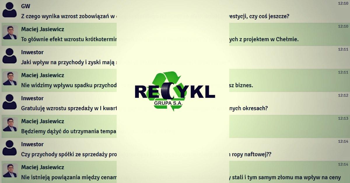 We wtorek, 30 czerwca 2020 r. odbył się czat inwestorski z zarządem Grupy Recykl, wiceprezesem zarządu, Maciejem Jasiewiczem oraz członkiem zarządu, Zbigniewem Fleszarem. Podczas spotkania rozmawialiśmy o wynikach finansowych za I kwartał 2020 roku. Inwestorzy zadawali również pytania o nowy zakład w Chełmie, przejście na Główny Rynek GPW, plany rozwoju na 2020 rok oraz wpływ pandemii COVID-19 na działalność spółki. W spotkaniu udział wzięło 500 osób, a zarząd odpowiedział na ponad 35 pytań. Zapraszamy do lektury całej relacji z czatu.