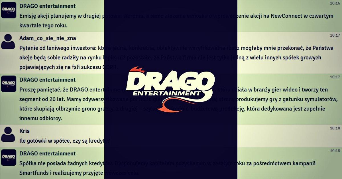 W środę, 8 lipca 2020 r. odbył się czat inwestorski z prezes zarządu DRAGO entertainment, Joanną Tynor oraz szefem studia, Lucjanem Mikociakiem. Podczas spotkania rozmawialiśmy o planowanym debiucie na NewConnect. Inwestorzy zadawali również pytania o emisję akcji, produkcję symulatorów oraz prace nad tytułem FrostFall. Spotkanie cieszyło się ogromnym zainteresowaniem - udział wzięło 1150 osób, a zarząd odpowiedział na blisko 50 pytań. Zapraszamy do lektury całej relacji z czatu.