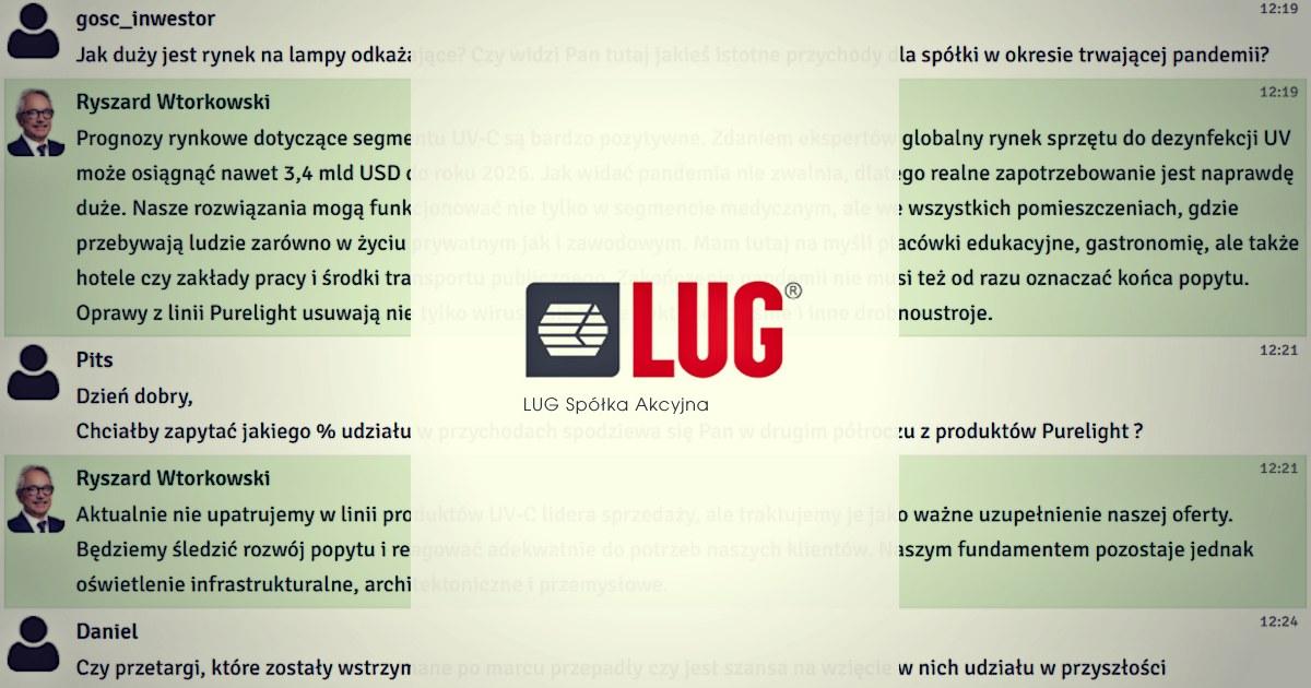 W czwartek, 13 sierpnia 2020 r. odbył się czat inwestorski z prezesem zarządu Grupy LUG, Ryszardem Wtorkowskim. Podczas spotkania rozmawialiśmy o wynikach finansowych za II kwartał 2020 roku. Inwestorzy zadawali również pytania o rynek lamp odkażających, wpływ pandemii na działalność spółki oraz realizację strategii. W spotkaniu wzięło udział blisko 400 inwestorów. Zapraszamy do lektury całej relacji z czatu.