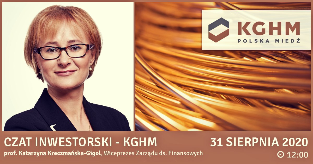 O wynikach finansowych KGHM za I półrocze 2020 roku oraz aktualnej sytuacji na rynku surowców będzie można porozmawiać na czacie inwestorskim, który odbędzie się 31 sierpnia 2020 r. o godz. 12:00. W spotkaniu spółkę będzie reprezentować wiceprezes zarządu ds. finansowych, prof. Katarzyna Kreczmańska-Gigol. Już teraz zapraszamy do zadawania pytań.