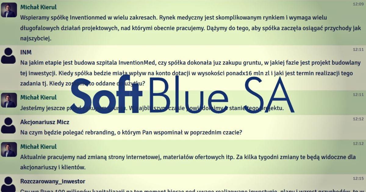 We wtorek, 15 września 2020 r. odbył się czat inwestorski z prezesem zarządu SoftBlue, Michałem Kierulem. Podczas spotkania rozmawialiśmy o aktualnej sytuacji spółki. Inwestorzy zadawali również pytania o budowę centrum B+R, rozwój produktowy spółki i inwestycję w spółkę InventionMed. W spotkaniu wzięło udział blisko 900 osób, a prezes zarządu odpowiedział na 46 pytań. Zapraszamy do lektury całej relacji z czatu.