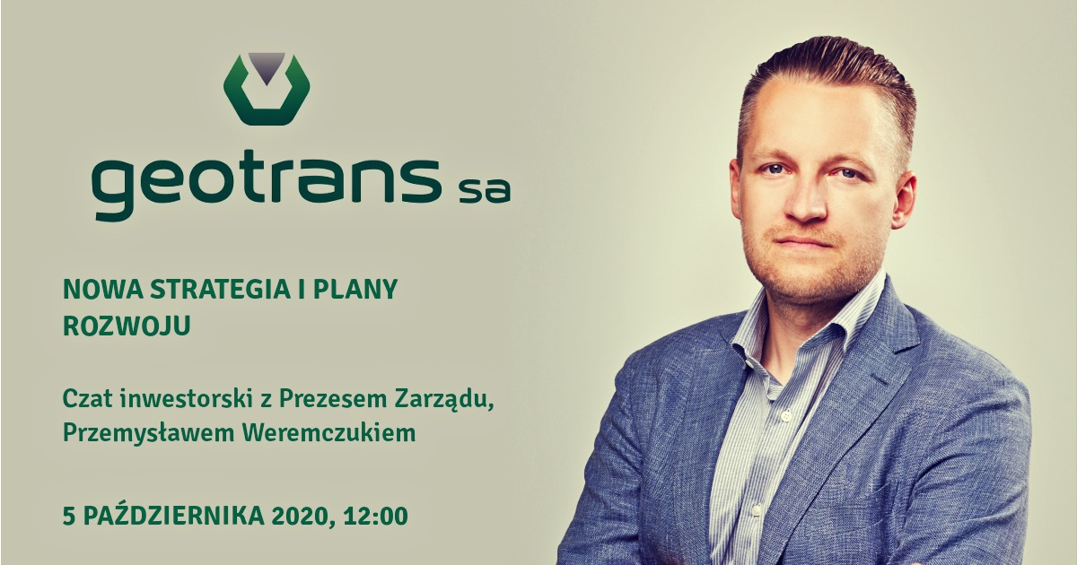 Szerzej o nowej strategii Geotransu oraz planach rozwoju na najbliższe kwartały będzie można porozmawiać z prezesem zarządu, Przemysławem Weremczukiem. Spotkanie rozpocznie się w poniedziałek, 5 października 2020 r. o godz. 12:00.