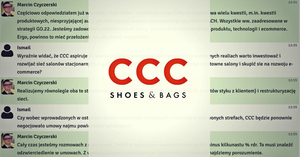 W piątek, 16 października 2020 r. odbył się czat inwestorski z prezesem zarządu Grupy CCC, Marcinem Czyczerskim. Podczas spotkania rozmawialiśmy o wynikach finansowych za II i III kwartał. Inwestorzy zadawali również pytania o działalność e-commerce, rozwój eobuwie, wpływ pandemii na sytuację grupy CCC oraz politykę dywidendową. W spotkaniu wzięło udział ponad 1250 osób, a prezes zarządu odpowiedział na 90 pytań. Zapraszamy do lektury całej relacji z czatu.