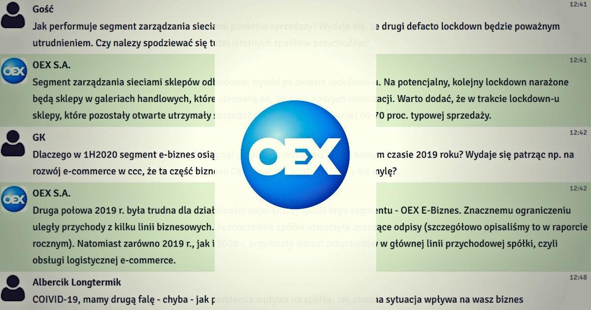 W czwartek, 22 października 2020 r. odbył się czat inwestorski z zarządem OEX S.A., Robertem Krasowskim, członkiem zarządu i dyrektorem finansowym oraz Tomaszem Kwietniem, członkiem zarządu. Podczas spotkania rozmawialiśmy o perspektywach rozwoju Grupy OEX. Inwestorzy zadawali również pytania o możliwe akwizycje, wypłatę dywidendy oraz wpływ pandemii COVID-19 na działalność spółek grupy. W spotkaniu wzięło udział blisko 400 osób, a zarząd spółki odpowiedział na 20 pytań. Zapraszamy do lektury całej relacji z czatu.