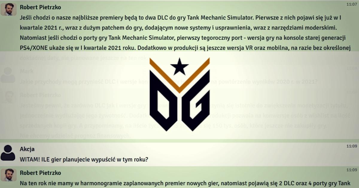 W środę, 13 stycznia 2020 r. odbył się czat inwestorski z prezesem zarządu DeGenerals, Robertem Pietrzko oraz współzałożycielem spółki, Michałem Flodrowskim. Podczas spotkania rozmawialiśmy o ofercie publicznej akcji. Inwestorzy zadawali również pytania o rozwój gry Tank Mechanic Simulator, plan premier oraz debiut na NewConnect.