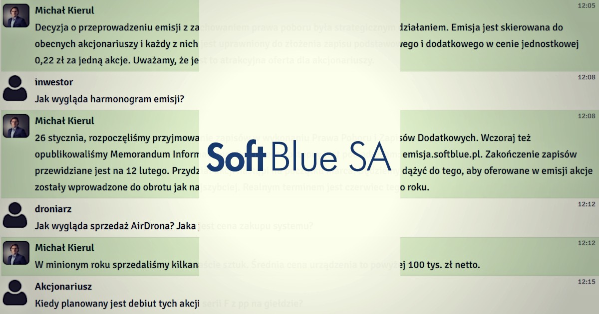 W środę, 27 stycznia 2021 r. odbył się czat inwestorski z prezesem zarządu SoftBlue, Michałem Kierulem. Podczas spotkania rozmawialiśmy o szczegółach emisji akcji. Inwestorzy zadawali również pytania o budowę centrum B+R, urządzenie AirDron oraz rozwój w segmencie IoT.