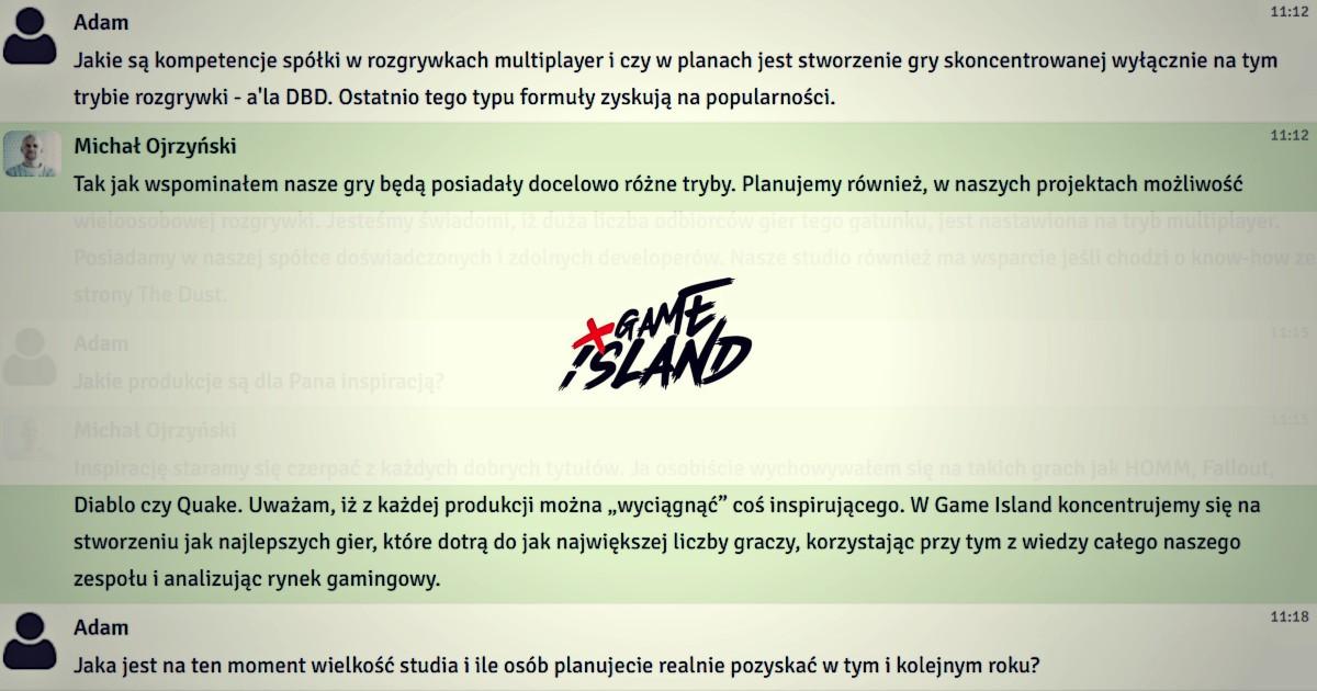 W czwartek, 18 lutego 2021 r. odbył się czat inwestorski z prezesem zarządu Game Island, Michałem Ojrzyńskim. Podczas spotkania rozmawialiśmy o szczegółach oferty publicznej akcji. Inwestorzy zadawali również pytania o produkcję gier survivalowych, współpracę z The Dust oraz model biznesowy spółki.