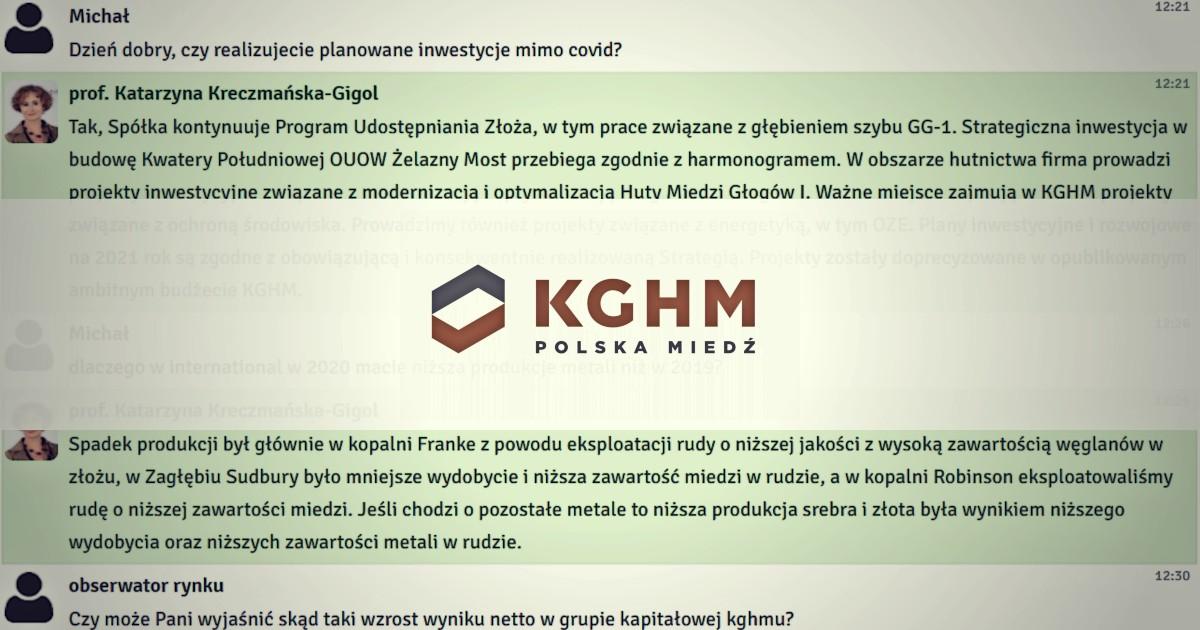 W poniedziałek, 29 marca 2021 r. odbył się czat inwestorski z Wiceprezes Zarządu ds. Finansowych KGHM Polska Miedź S.A., prof. Katarzyną Kreczmańską-Gigol. Podczas spotkania rozmawialiśmy o wynikach finansowych za 2020 rok. Inwestorzy zadawali również pytania o realizowane inwestycje, działalność w czasie pandemii COVID-19 oraz rynek miedzi.