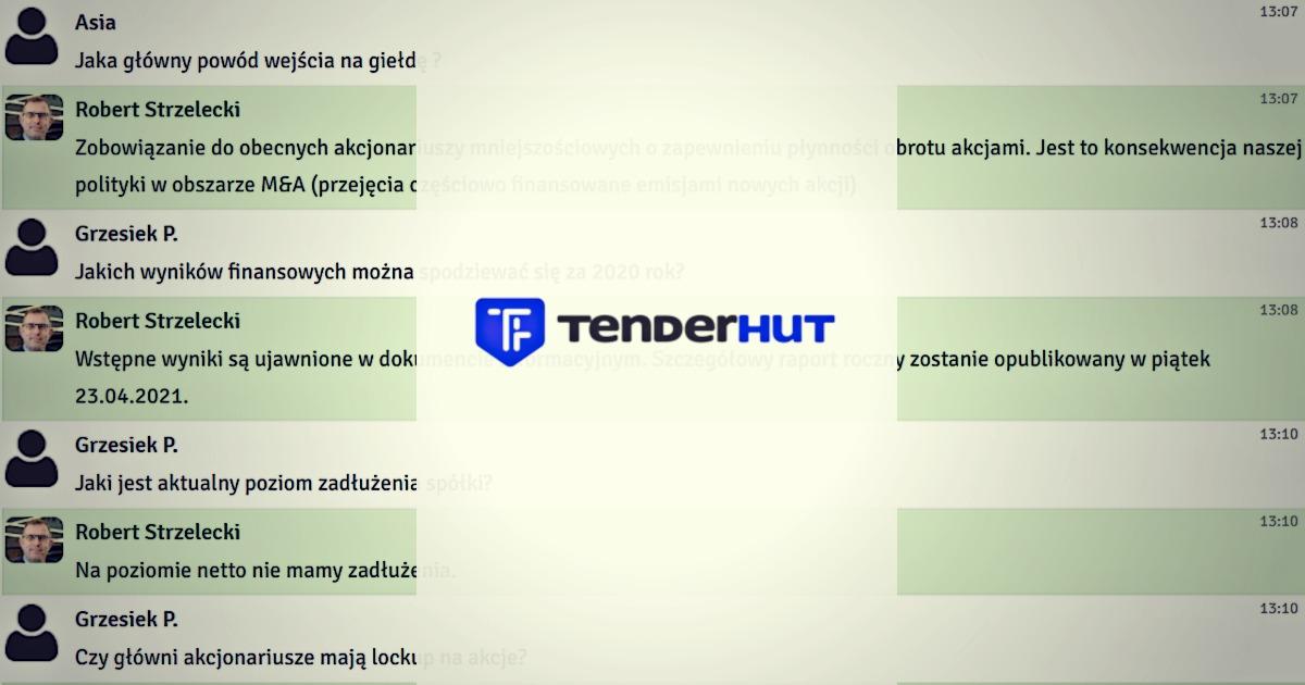 W poniedziałek, 19 kwietnia 2021 r. odbył się czat inwestorski z prezesem zarządu TenderHut, Robertem Strzeleckim. Podczas spotkania rozmawialiśmy o debiucie na rynku NewConnect. Inwestorzy zadawali również pytania o plany rozwoju, akwizycje oraz spółki zależne.