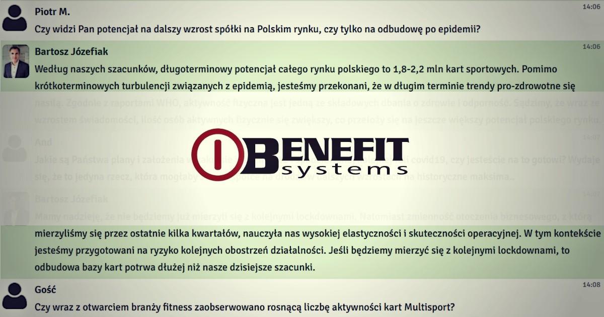 We wtorek, 1 czerwca 2021 r. odbył się czat inwestorski z członkiem zarządu ds. finansowych Benefit Systems, Bartoszem Józefiakiem. Podczas spotkania rozmawialiśmy o wynikach finansowych za I kwartał 2021 roku. Inwestorzy zadawali również pytania o otwarcie branży fitness, aktywność kart Multisport oraz działalność na rynkach zagranicznych.