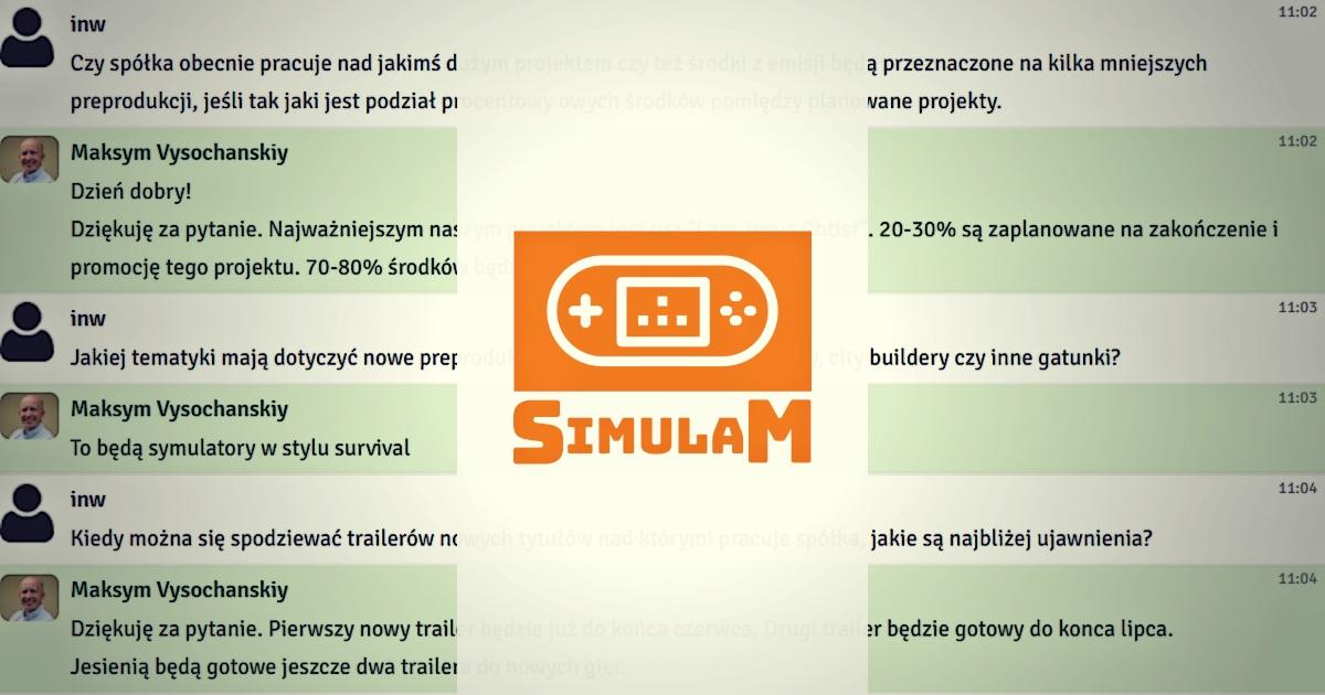 W poniedziałek, 7 czerwca 2021 r. odbył się czat inwestorski z prezesem zarządu SimulaM, Maksymem Vysochanskiym. Podczas spotkania rozmawialiśmy o szczegółach oferty publicznej akcji. Inwestorzy zadawali również pytania o plany debiutu na NewConnect, model biznesowy oraz nadchodzące premiery.