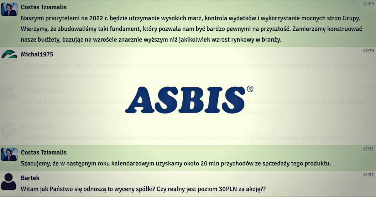 W piątek, 13 sierpnia 2021 r. odbył się czat inwestorski z Dyrektorem ds. Relacji Inwestorskich ASBIS, Costasem Tziamalisem. Podczas spotkania rozmawialiśmy o wynikach finansowych spółki. Inwestorzy zadawali również pytania o wypłatę dywidendy, sprzedaż Perenio Ionic Shield oraz najnowsze prognozy finansowe.