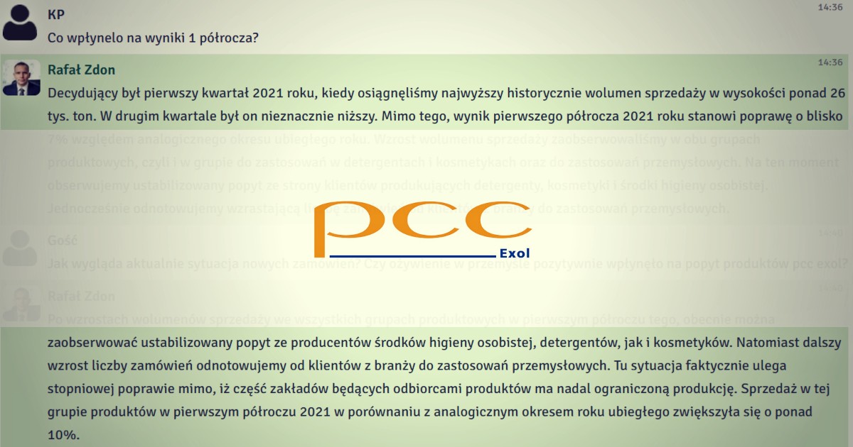 „Pierwsze półrocze 2021 roku oceniamy jako bardzo dobry dla nas okres, mimo niesprzyjających uwarunkowań zewnętrznych” - relacja czatu z wiceprezesem zarządu PCC Exol