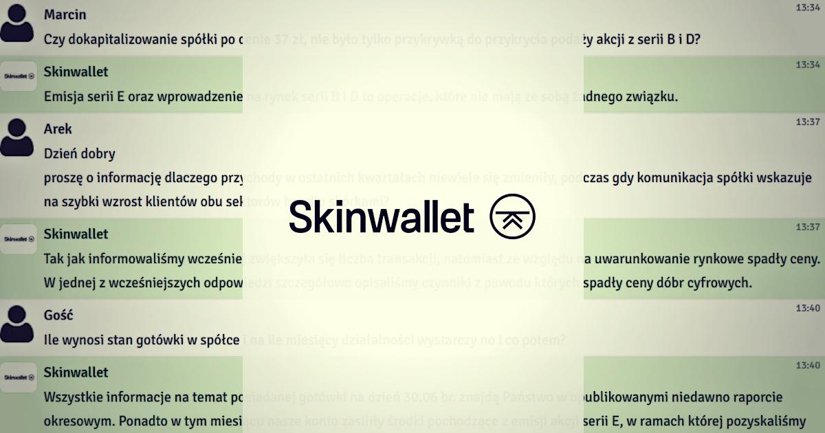 W środę, 25 sierpnia 2021 r. odbył się czat inwestorski z zarządem Skinwallet - Kornelem Szwają oraz Dawidem Chomiczem. Podczas spotkania rozmawialiśmy o wynikach finansowych za I półrocze 2021 roku. Inwestorzy zadawali również pytania o działalność na rynku NFT, aktualną sytuację spółki oraz szczegóły przeprowadzonej emisji akcji.