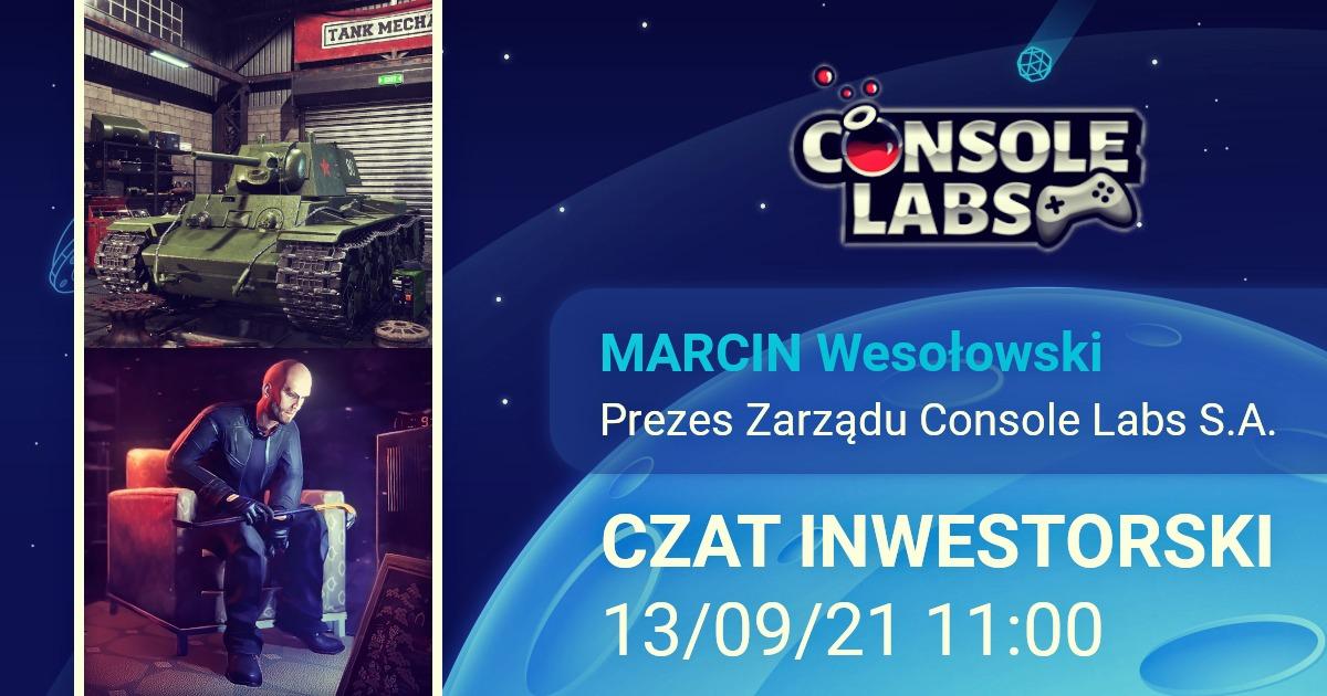 W poniedziałek, 13 września 2021 r. o godz. 11:00 zapraszamy na czat inwestorski z prezesem zarządu Console Labs, Marcinem Wesołowskim. Podczas czatu zostaną omówione plany rozwoju spółki. Inwestorzy będą mogli zadawać pytania.