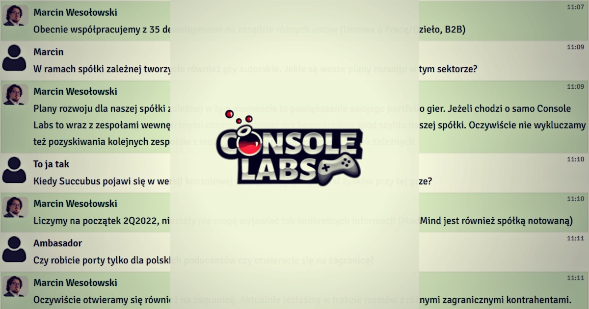 W poniedziałek, 13 września 2021 r. odbył się czat inwestorski z prezesem zarządu Console Labs, Marcinem Wesołowskim. Podczas spotkania rozmawialiśmy o planach rozwoju spółki. Inwestorzy zadawali również pytania o portowanie gier na konsole, autorskie produkcje oraz debiut na rynku NewConnect.
