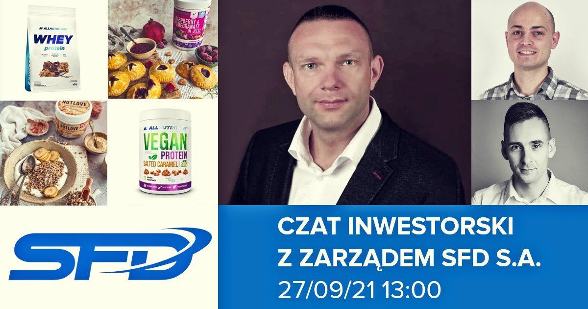 O wynikach spółki, planach rozwoju, w tym rozwoju na rynkach zagranicznych będzie można porozmawiać z zarządem SFD, z prezesem zarządu Mateuszem Pazdanem, Przemysławem Kwiatkowskim, wiceprezesem zarządu ds finansowych i administracyjnych oraz Bartoszem Kogutem, wiceprezesem zarządu. Spotkanie odbędzie się 27 września 2021 r. o godz. 13:00.