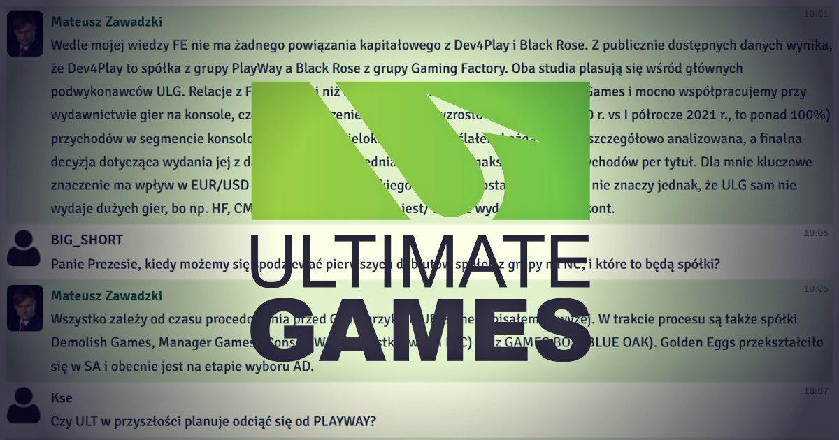 W piątek, 24 września 2021 r. odbył się czat inwestorski z prezesem zarządu Ultimate Games, Mateuszem Zawadzkim. Podczas spotkania rozmawialiśmy o wynikach finansowych za I półrocze 2021 roku. Inwestorzy zadawali również pytania plany wydawnicze, spółki zależne, czy politykę dywidendową.