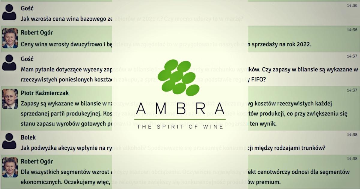 We wtorek, 9 listopada 2021 r. odbył się czat inwestorski z prezesem zarządu Grupy AMBRA, Robertem Ogórem oraz wiceprezesem, Piotrem Kaźmierczakiem. Podczas spotkania rozmawialiśmy o wynikach finansowych za I kwartał 2021/2022 roku. Inwestorzy zadawali również pytania o sytuację na rynku wina, rozwój produktów, działalność na rynkach zagranicznych oraz politykę dywidendową.