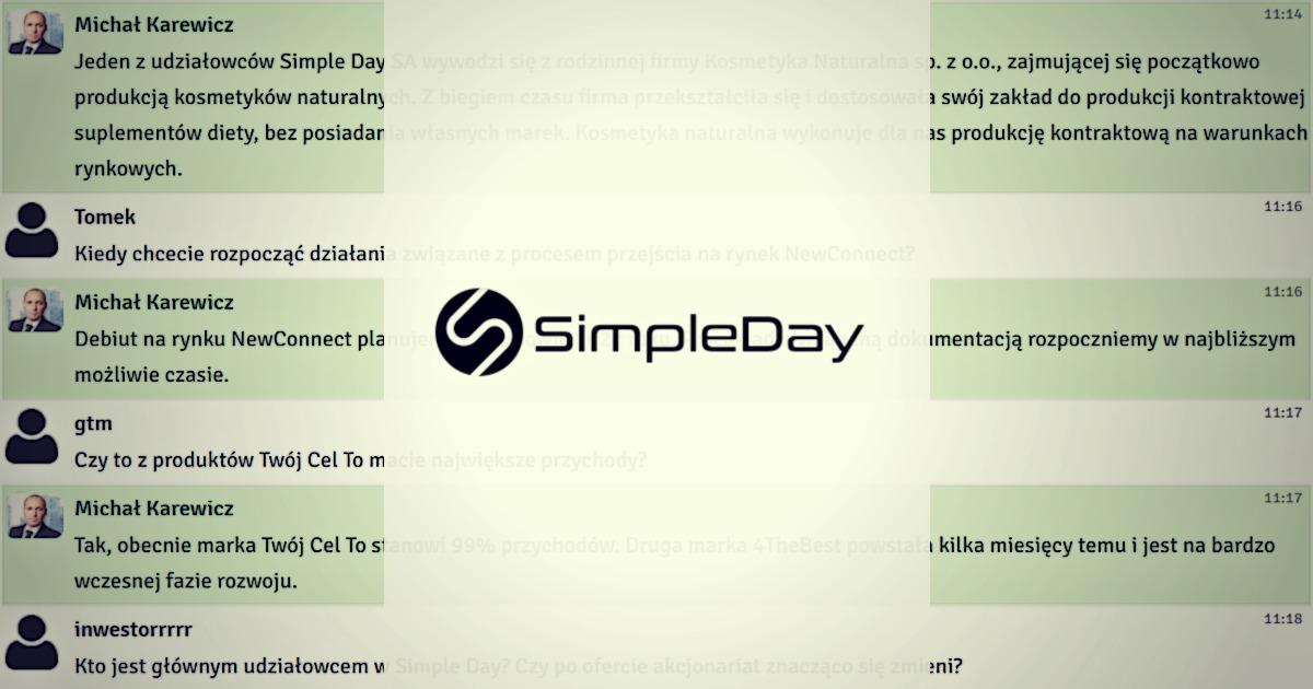 W piątek, 19 listopada 2021 r. odbył się czat inwestorski z prezesem zarządu Simple Day, Michałem Karewiczem. Podczas spotkania rozmawialiśmy o szczegółach oferty publicznej akcji. Inwestorzy zadawali również pytania o plany debiutu na rynku NewConnect, rozwój marki Twój Cel To oraz perspektywy dla rynku e-commerce.