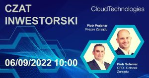We wtorek 6 września 2022 r. o godzinie 10:00 zapraszamy na czat z prezesem zarządu Cloud Technologies, Piotrem Prajsnarem oraz CFO i członkiem zarządu, Piotrem Soleńcem. Podczas spotkania zostaną omówione wyniki finansowe za II kwartał br. i plany rozwoju. Po prezentacji spółki, zapraszamy na czat inwestorski, gdzie będzie można zadać zarządowi pytania.