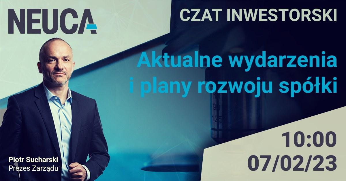 O bieżącej sytuacji oraz planach rozwoju Grupy NEUCA będzie można porozmawiać z Piotrem Sucharskim, prezesem zarządu spółki. Spotkanie odbędzie się we wtorek, 7 lutego 2023 roku o godzinie 10:00.