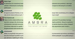 We wtorek, 9 maja 2023 r. odbył się czat inwestorski z prezesem zarządu Grupy AMBRA, Robertem Ogórem oraz wiceprezesem, Piotrem Kaźmierczakiem. Podczas spotkania rozmawialiśmy o wynikach finansowych za III kwartał 2022/2023 roku. Inwestorzy zadawali również pytania o sytuację na rynku wina, potencjalne akwizycje oraz wzrost kosztów.