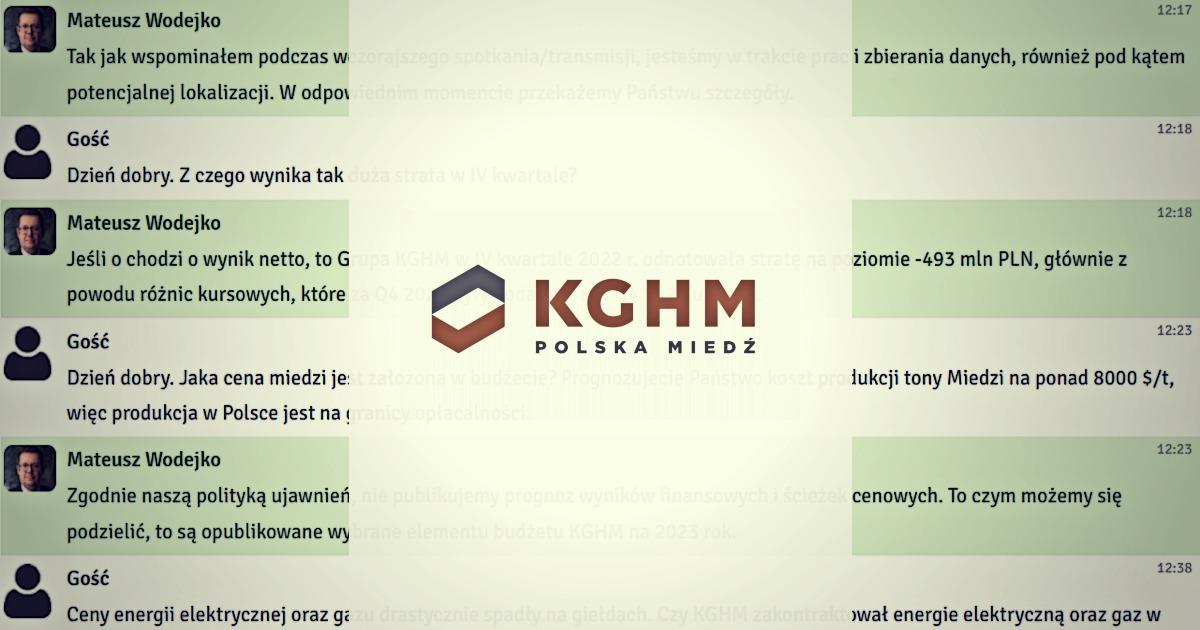 W piątek, 19 maja 2023 r. odbył się czat inwestorski z wiceprezesem zarządu KGHM ds. finansowych, Mateuszem Wodejko. Podczas spotkania rozmawialiśmy o wynikach finansowych za I kwartał 2023 roku. Inwestorzy zadawali również pytania o sytuację na rynku miedzi, politykę dywidendową oraz realizację strategii.