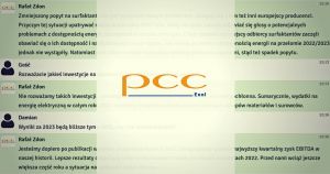 We wtorek 30 maja 2023 r. odbył się czat inwestorski z wiceprezesem zarządu PCC Exol, Rafałem Zdonem. Podczas spotkania rozmawialiśmy o wynikach finansowych spółki za I kwartał 2023 roku. Inwestorzy zadawali również pytania o politykę dywidendową oraz ewentualne inwestycje.
