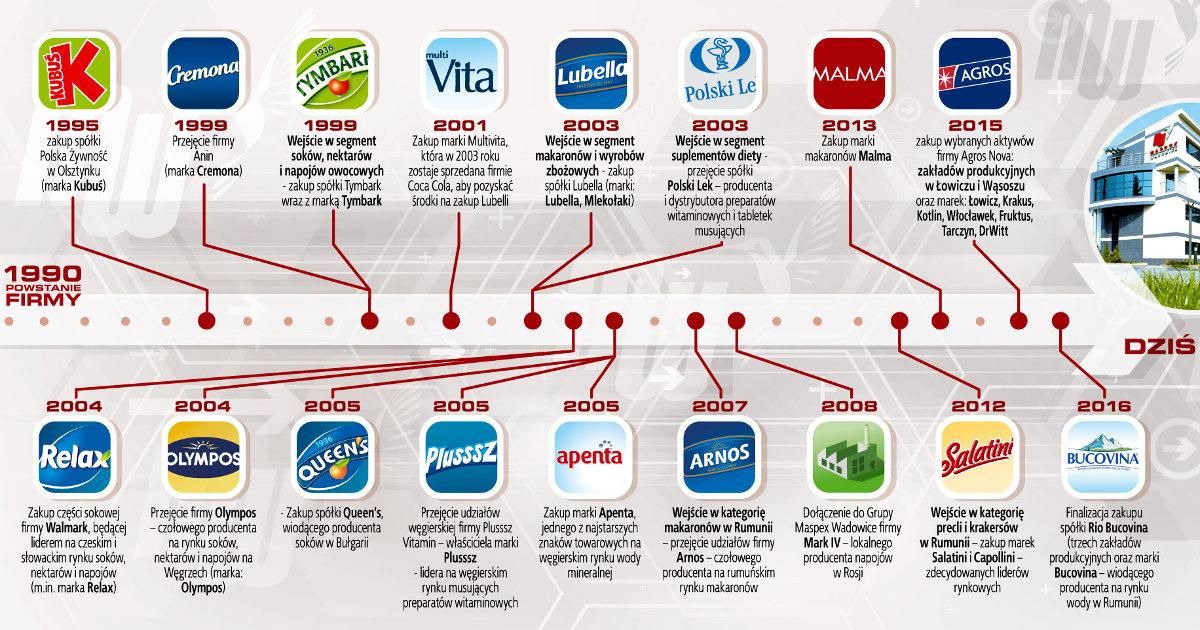 Maspex to grupa, która w ostatnich kilkunastu latach rosła dynamicznie – głównie poprzez przejęcia innych firm. Ostatnim nabytkiem jest Rio Bucovina - producent wody z Rumunii.