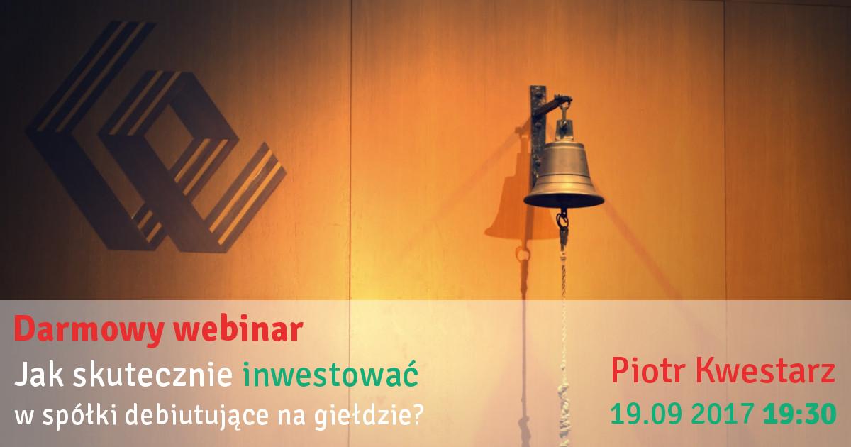 Zapraszamy na webinar specjalny poświęcony inwestowaniu w spółki debiutujące na giełdzie. Spotkanie poprowadzi Piotr Kwestarz ze Strefy Inwestorów, który od wielu lat zajmuje się analizą wszystkich debiutów na GPW. Webinar odbędzie sie we wtorek, 19 września 2017 r. o godzinie 19:30.