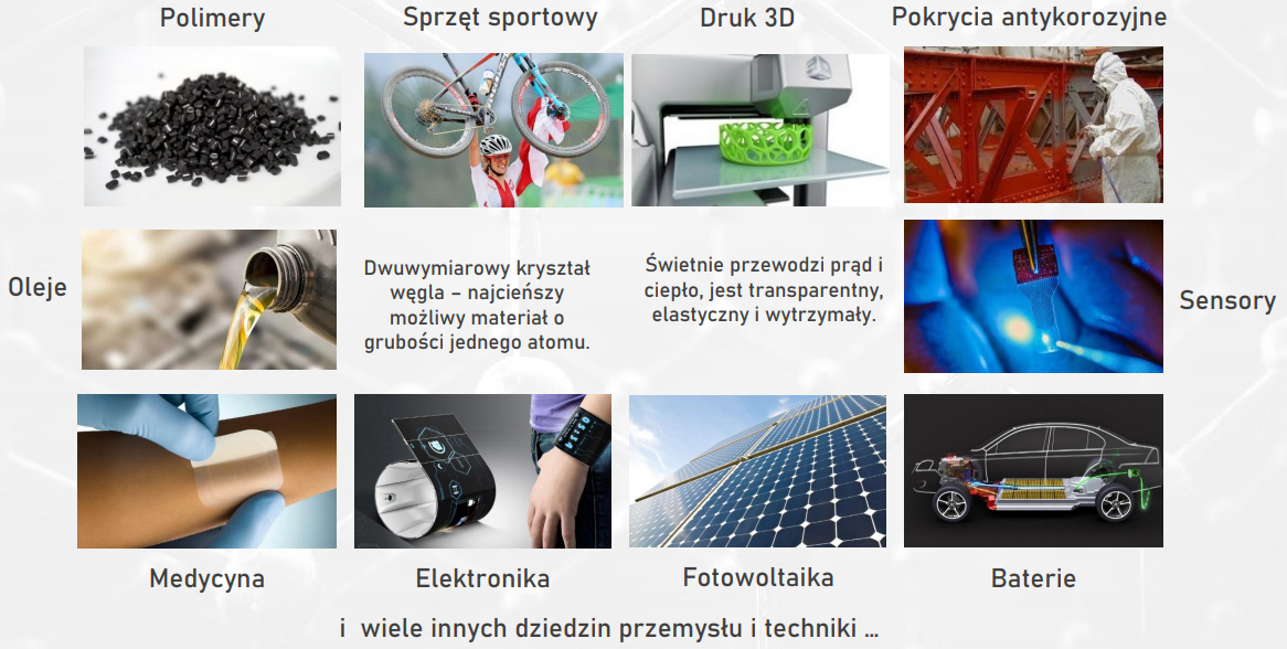 „Grafen to jeden z najciekawszych materiałów przyszłości o grubości atomu węgla. Jest wyjątkowo elastyczny, jest półprzewodnikiem o zerowej przerwie energetycznej, świetnie przewodzi ciepło i jest transparentny. Korzystając z doświadczeń międzynarodowych naukowców, opracowaliśmy własną, unikalną metodę wytwarzania grafenu. Wspólnie z producentami z branży takich jak: akcesoria sportowe, chemia czy elektronika opracowaliśmy prototypy jego zastosowania.” - wyjaśnia prof. dr hab. inż. Łukasz Kaczmarek współudziałowiec AGP.