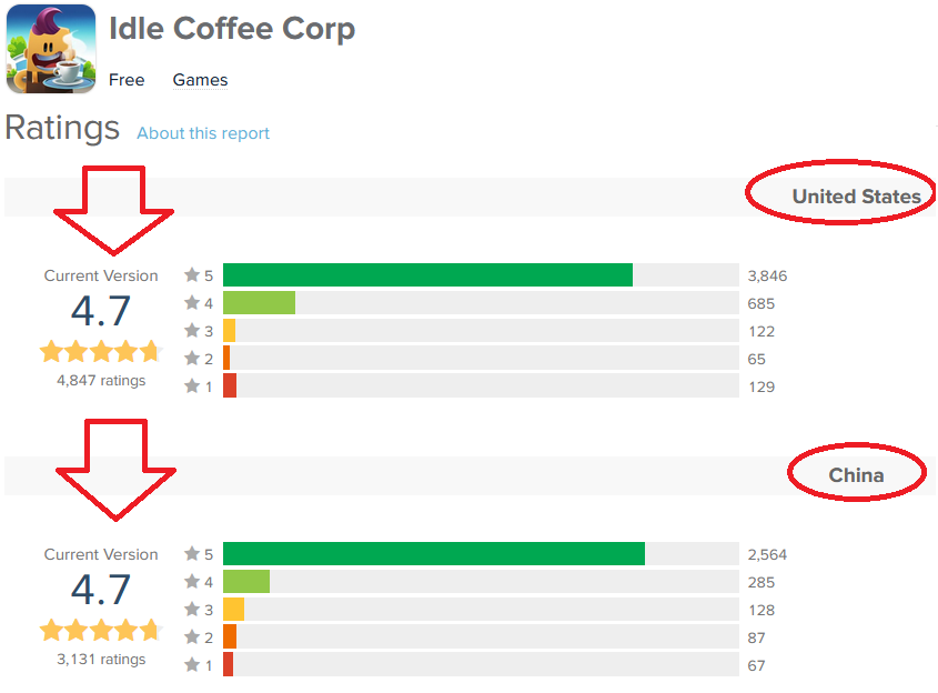 Idle Coffee Corp zbiera bardzo dobre opinie. Dane portalu Appannie.com prezentują ratingy gry składający się z ocen samych graczy, który aktualnie wskazuje w Chinach ocenę 4,7/5. Taką samą ocenę wystawili amerykańscy gracze. Jest to już dość miarodajny wskaźnik, gdyż jest oparty na kilkutysięcznej ilości oddanych głosów – w Chinach ilość oddanych głosów przekroczyła 3000, a w USA zbliża się do 5000.
