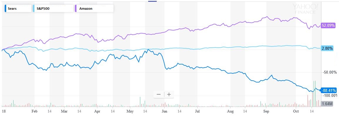 Notowania spółki Sears na tle S&P500 i spółki Amazon w 2018 roku