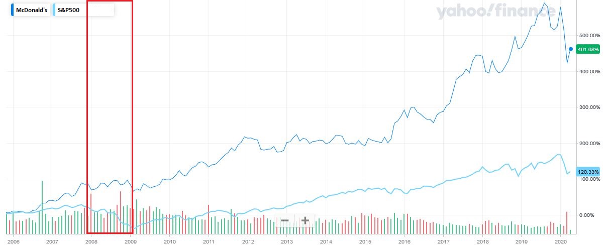 Przypomnijmy, że McDonald’s był jednym z największych wygranych recesji z roku 2008. Jego przychody w tamtym kryzysowym roku wzrosły znacznie bardziej, niż w poprzednich latach. Jego mocną pozycję odzwierciedlało zachowanie kursu akcji – McDonald’s był wtedy tzw. spółką defensywną (patrz wykres niżej). Całą historię o tym, jak McDonald’s wyszedł zwycięsko z wielkiego kryzysu finansowego opisał m.in. portal Slate.
