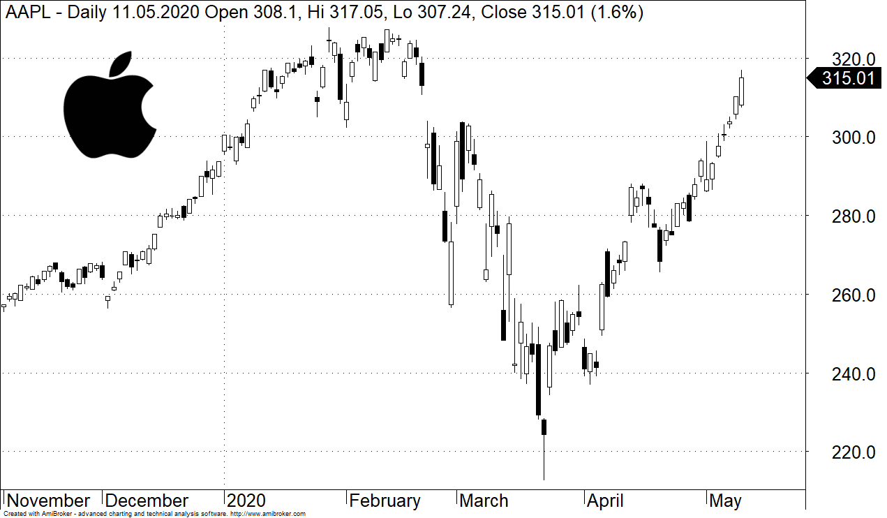 Początkowo kurs akcji Apple ucierpiał na wybuchu pandemii COVID-19, jednak już powraca do maksimów z początku 2020 roku. Już 14 maja akcjonariusze spółki otrzymają dywidendę w wysokości 0,82 USD za akcję.