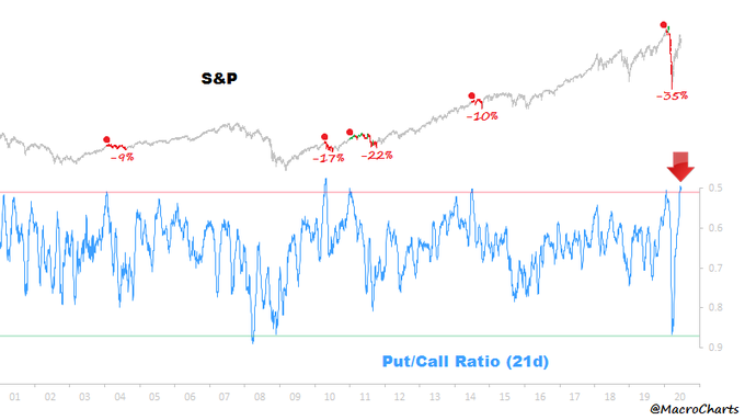 Może i podejście profesjonalnych inwestorów do Robinhoodziarzy jest z czysto ludzkiego punktu widzenia niefajne, ale coraz większa liczba analityków ostrzega przed tym, że sentyment na rynku akcji jest po prostu… zbyt dobry, a do tego pojawiła się na nim optymistyczna „ulica”. Wiele mówi poniższy wykres, pokazujący punkty skrajnego optymizmu „ulicy” na kontraktach na S&P500. Historycznie rzecz biorąc, tak duży optymizm ulicy nie zwiastował w nadchodzących tygodniach i miesiącach niczego dobrego…