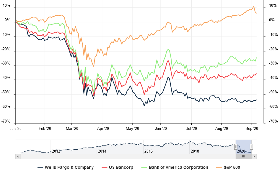 Notowania Wells Fargo, Bank of America, US Bancorp na tle S&P500 w 2020 roku