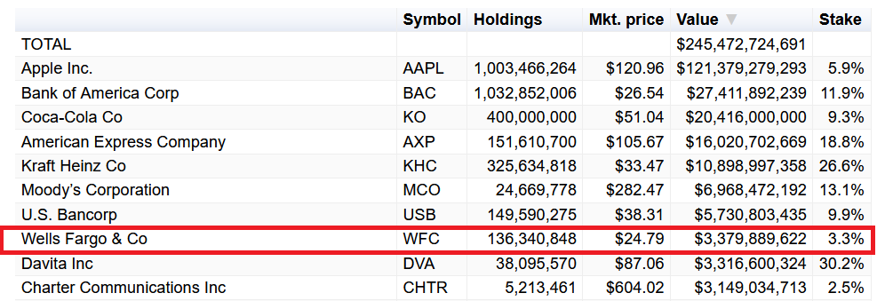 Mimo to, BRK ma wciąż dużą ekspozycję na banki. Ma 11,9% akcji Bank of America o wartości 27,4 mld USD (druga największa wartościowo pozycja w portfelu), 9,9% akcji US Bancorp (o wartości 5,7 mld USD). Pakiet 3,3% akcji Wells Fargo jest wyceniany obecnie na około 3,4 mld USD.